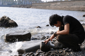 波打ち際にしゃがみこみ石を裏返す道尾さん。“子供と海”というと磯遊びが浮かんでくるという。
